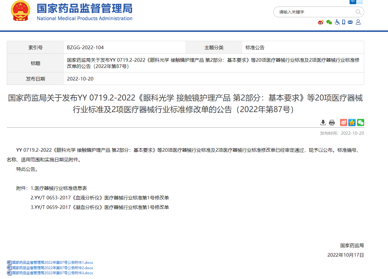 國(guó)家藥監(jiān)局關(guān)于發(fā)布YY 0719.2-2022《眼科光學(xué) 接觸鏡護(hù)理產(chǎn)品 第2部分:基本要求》等20項(xiàng)醫(yī)療器械行業(yè)標(biāo)準(zhǔn)及2項(xiàng)醫(yī)療器械行業(yè)標(biāo)準(zhǔn)修改單的公告(2022年第87號(hào))