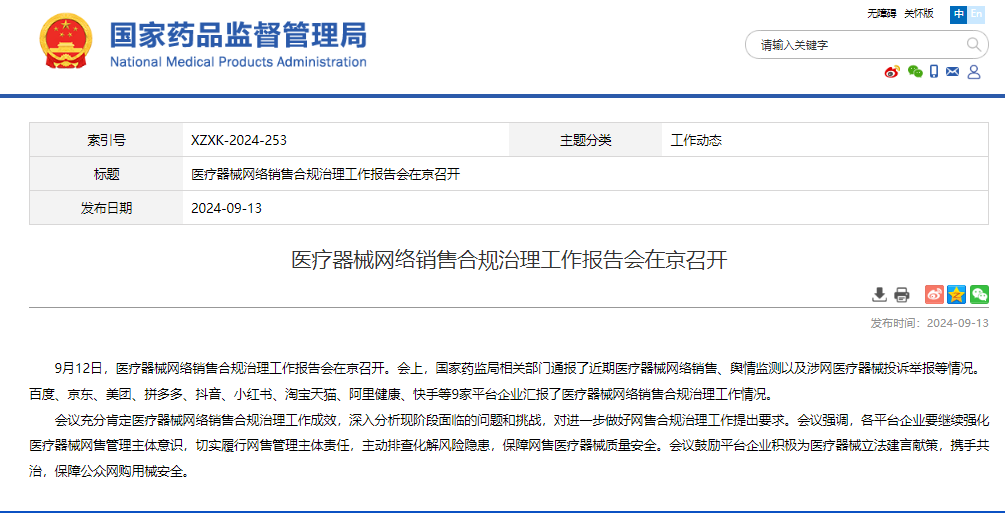 9月12日,醫(yī)療器械網(wǎng)絡(luò)銷售合規(guī)治理工作報告會在京召開。會上,國家藥監(jiān)局相關(guān)部門通報了近期醫(yī)療器械網(wǎng)絡(luò)銷售、輿情監(jiān)測以及涉網(wǎng)醫(yī)療器械投訴舉報等情況。百度、京東、美團(tuán)、拼多多、抖音、小紅書、淘寶天貓、阿里健康、快手等9家平臺企業(yè)匯報了醫(yī)療器械網(wǎng)絡(luò)銷售合規(guī)治理工作情況。
