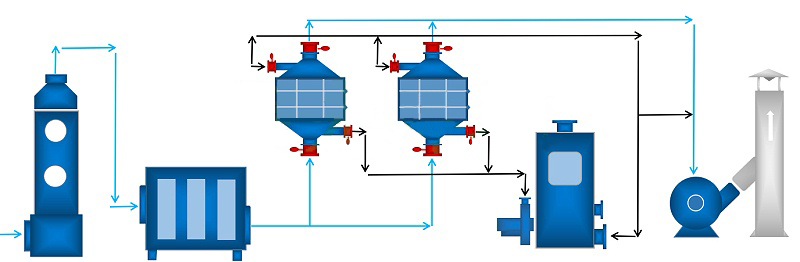 (2)完成解吸脫附以后活性炭吸附器Ⅰ進(jìn)入待用狀態(tài),待活性炭吸附器Ⅱ接近飽和時(shí),系統(tǒng)再自動(dòng)切換回來(lái),同時(shí)對(duì)活性炭吸附器 Ⅱ進(jìn)行解吸脫附,如此循環(huán)工作。